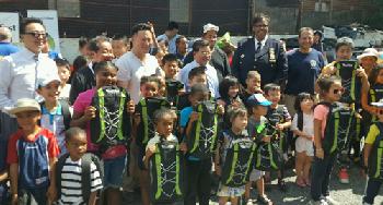 (紐約.羊展恬27日報導)市警109分局與州眾議員金兌錫、市議員顧雅明、法拉盛華商會及第一保健等聯合主辦返校日送書包活動,昨日中午起在109分局停車場舉行,向社區適齡兒童免費派發800個新書包及文具用品等,結果吸引眾多社區孩童踴躍參與。