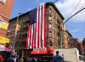 (紐約.留天佑6日報導)紐約華埠勿街夾喜士打街,每年都會在911紀念日之前數天,張掛一面曾經在世貿遺址飄揚2個月的巨型國旗(圖),以示對國家的支持。意大利裔旗主John Casalinuovo近日趁週末休息,再次把國旗掛於其勿街116號物業牆上,引來不少遊客駐足拍照留念。