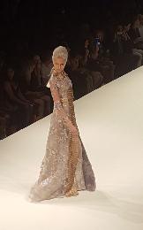 服裝設計師馬蘭布瑞頓昨日舉辦2017年春夏時裝展,圖為模特展示具有台灣意象元素的服飾。(圖:羊展恬攝)