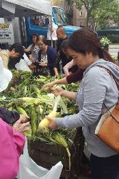 (紐約.羊展恬29日報導)由大法拉盛西商會等主辦每週三在法拉盛楓葉大道公園開設的綠色農夫市場,由於到場販賣蔬果的農場提供了各式新鮮蔬果,自開辦至今三個月以來成效良好,其中以玉米最為搶手,價廉物美成為華人民眾爭相購買的熱賣品,昨日一早開始營業以來人潮不斷,30箱玉米全部銷售一空。