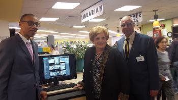 市議員克羅維茲(中)昨日在皇后區公共圖書館館長瓦科(左)及保安部門主任戴力(右)陪同下,前往位於皇后區雷哥公園分館視察新設錄像設備情形,對於現代科技的進步及錄像設備的快速發展、清晰影像都留下深刻的印象。(圖:羊展恬攝)