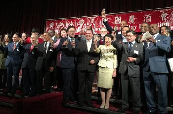 駐紐約台北經文處5日晚間在紐約萬豪飯店舉行中華民國105年雙十國慶酒會,來自紐約州、市、新州、賓州各界代表,各國駐聯合國代表及駐紐約領事團等數百位嘉賓共襄盛舉,徐儷文大使並與出席來賓共同舉杯,慶賀中華民國105年國慶。(圖:羊展恬攝)