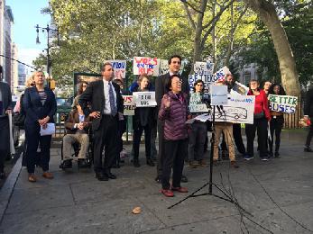 關注人士昨日早上在市政廳外集會(圖),指紐約市作為國際大城市,公共巴士服務是強差人意,比全國各大城市包括羅省、費城、華府、波士頓、芝加哥等都要低效,也是因為如此,巴士搭乘人數連年下降,自2002年有統計以來,巴士搭乘人數已減少近20%。