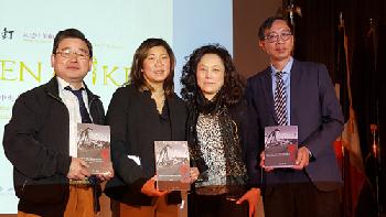 上海市地方誌辦公室副主任暨副教授生鍵紅(右二),昨日在皇后圖書館法拉盛分館進行紐約之行第4場演說,介紹她所著作的「金色道釘—築建中美和平發展之路」,並向出席嘉賓顧雅明、孟昭文(左一、二)及邱辛燁(右一)贈書。(圖:羊展恬攝)