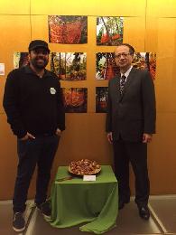 (紐約.羊展恬28日報導)駐紐約台北經文處昨晚舉辦「2016年環境創意藝術競賽展」頒獎暨閉幕典禮。由經文處副處長蘇瑞仁及紐約環保團體「人類影響學會」執行長蒂浦緹(Tara DePorte)共同主持,副處長蘇瑞仁(右)並頒發首獎2000元給印度行動藝術家魏克蘭(Vikram Arora)。