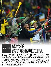 (南非)為了給新生兒起一個最有紀念意義的名字,南非媽媽們紛紛在足球和世界杯上找靈感。6月24日,南非一名新晉媽媽為剛出生的女兒起名FIFA(國際足聯的英文縮寫)。其他“足球”名字還有:Bafana(球迷對南非足球隊的昵稱,指男孩、小夥子)、Ke Nako(當地一種祖魯語,意為“開始了”)、Mexico,甚至足球場的名字Soccer City等等。球迷們希望借這些名字來紀念南非世界杯。