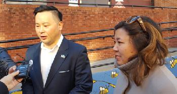 國會眾議員孟昭文(右)及州眾議員金兌錫兩人昨日上午連袂前往20小學投票站觀察投票情況,並對亞裔選民的熱情參與投票表示欣慰。(圖:羊展恬攝)