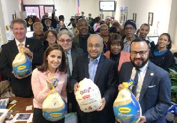 (紐約.羊展恬16日訊)一年一度感恩節即將來臨,為讓社區貧困家庭可以歡度感恩佳節,包括國會議員克勞利(Joseph Crowley)、州參議員佩拉爾塔(Jose Peralta,前排右二)、州眾議員莫亞(Francisco Moya)(前排右一)及多位社區領袖代表一起合作,昨日齊聚在州參議員佩拉爾塔皇后區辦公室前舉行記者會,宣佈向社區送出一千隻火雞,並祝福民眾節日快樂。