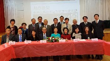 高碩泰大使(前排右四)3日前往華埠拜訪紐約中華公所等各大僑團,受到中華公所主席蕭貴源(前排左三)等紐約僑界元老熱情迎接,高碩泰感謝傳統僑社的長久以來的支持,並承諾會加強對僑胞的服務與照顧。(圖:中華公所提供)