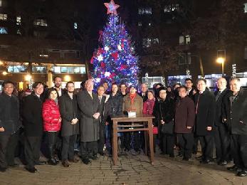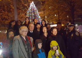 眾多社區僑領、政府官員代表和居民2日晚齊聚孔子大廈花園廣場聖誕樹前,在華埠兒童培護中心孩童天真的歌舞表演及海外宣導會姐妹合唱團唱詩班的優美歌聲中,點亮燈火,感受節日的溫暖。