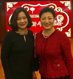 中國駐紐約總領館昨晚在紐約總領館舉行媒體新年招待會,紐約明報行政總裁劉正廷(左)親自出席,並向副總領事張美芳(右)賀節。(圖:羊展恬攝)
