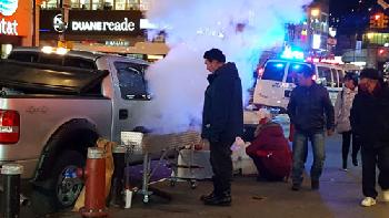 法拉盛市中心新年首日出現中國新疆的維吾爾族移民家庭在街頭違規擺攤,開放式的炭火在架上燃燒,令到場取締的警員都大吃一驚。(圖:本報讀者提供)