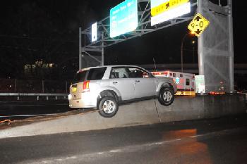(紐約.明報12日訊)皇后區友聯高速路(Union Turnpike)週二晚發生了一起罕見交通事故。一輛SUV車主自稱因遵循GPS導航,將車開到了道路中間的水泥隔離帶上,車輪幾乎懸空。