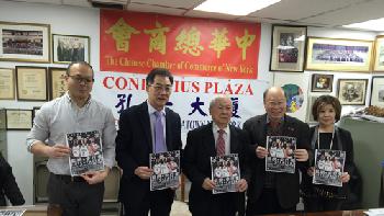 為慶祝農曆春節,紐約中華總商會及青商部昨日宣佈,將在2月3日在布碌崙巴克萊中心舉行「籃網中國之夜」,歡迎社區民眾共襄盛舉。圖為出席記者會代表自左至右:李國威、鄧遐勳、李可喬、于金山、田麗美。(圖:紐約中華總商會提供)