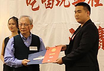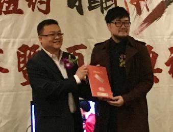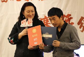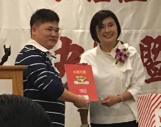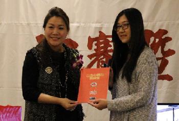 一等獎9號選手唐威獲得1千元現金,由贊助企業代表il Villaggio Consulting Inc.董事長狄鍾琪(右)頒發,由唐威的太太唐心美(左)代表領獎。