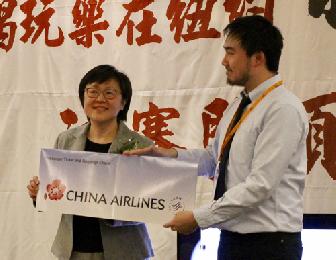 幸運獎長榮航空機票由Yun Qiu(右)獲得由長榮紐約分公司總主任張宇堂(左)頒發。