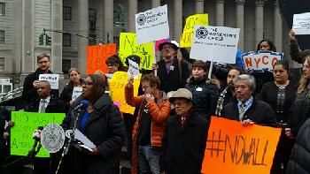 詹樂霞昨日與各族裔社團支持者齊聚一堂,大聲譴責川普築牆政策的做法違背美國建國原則,歧視移民。她表示,美國是由來自全世界移民者所建立的國家,移民受到美國憲法保護,築牆政策會造成國家分裂,沒有必要也不需要,紐約市作為移民城市,也是移民者的庇護所,她代表所有族裔向川普的築牆政策說「不!」。