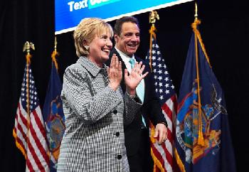 (明報13日訊)紐約州長葛謨昨日在紐約市立大學拉瓜地亞社區學院(LaGuardia Community College)為紐約州今年第一項提案「公立大學免費計劃案(Excelsior Scholarship)」,舉行法令簽署儀式。前國務卿、前民主黨總統參選人希拉莉驚喜現身,全場掀起一陣尖叫與歡呼聲(圖)。
