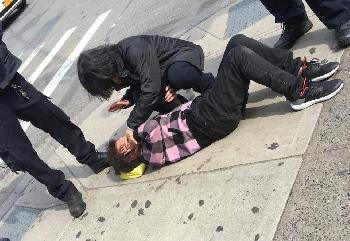 (明報28日訊)法拉盛市中心昨日發生一起搶劫案件,3名非裔青年在大白天向一家位於緬街近羅斯福大道的華人飾品店行搶,該店老闆及老闆娘因追趕搶匪卻遭到匪徒打傷,老闆娘被匪徒擊倒在地受傷,手摀面部。多名路人見狀報警後,109分局警察和救護車隨後趕到,將受害者送往附近醫院救治。