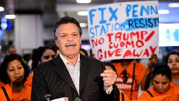 近日,紐約一些等權益組織在賓州車站集會,指責葛謨與美國總統川普將華爾街利益放在修復地區交通體系退化之前。