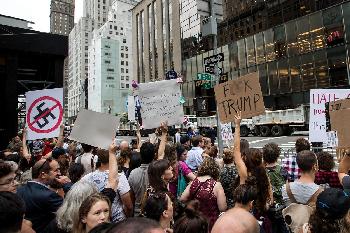 總統車隊進入到川普大廈的地下停車場時,抗議者高呼著口號「恥辱!恥辱!」,這是由於週末在弗吉尼亞州夏洛茨維爾發生的致命暴力事件,以及總統川普最初拒絕譴責白人至上主義者所引起的憤怒。此外,一小群(大約16人)川普支持者,被警察隔離起來,這些支持者高喊著「讓美國變白」,並且揮舞著旗幟,嘲弄其他示威者,川普的支持者不得不待在川普大廈前的警察圍欄裡。