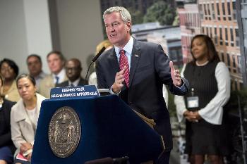 紐約住房計劃始於2014年。市政府對可支付住房的興建進行了撥款,為全市逾7.8萬家庭提供了可支付住房保障。這一舉措,使得本屆政府在其首個任期內保障了1978年以來最多的可支付住房。這項計劃的執行,使得收入少於2.5萬的可支付住房股東股份翻了三番。政府對建築住房的投資與保障也翻兩番。