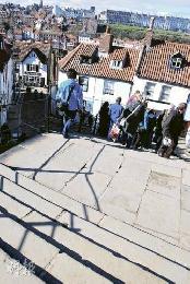 Whitby Abbey旁是St.Mary's Church,教堂旁有著一片漂亮墓園(當然,入黑後的晚上自然是另一番味道)。經過墓地便是著名的199Steps,年輕力壯的遊客喜歡先苦後甜,從下爬上。細心留意,梯級除了名副其實有199級,每隔十數級便有一特寬梯級,那是讓抬棺木的工人稍為休息的地方。
