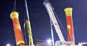 象徵民族團結的56根民族團結柱於9月14日國慶60週年前夕分批擺放在天安門廣場,每根柱子高13.6米,重26噸,柱體採用水泥和鋼結構作支架,外包玻璃鋼,水泥底座重達21噸,號稱可抵抗11級強風,還安裝了避雷針。(明報新聞網)